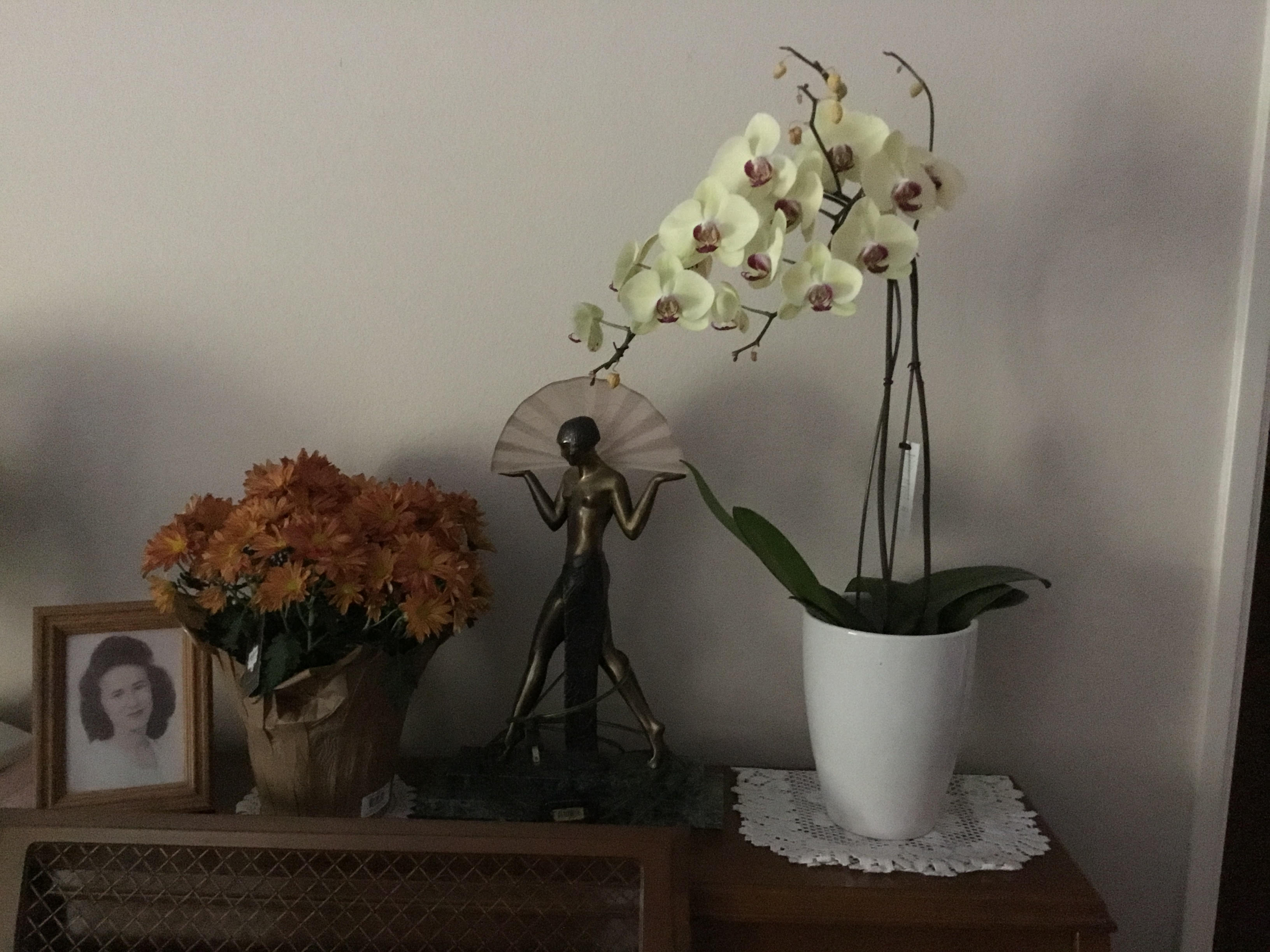 - Mums, orchids, lamp, betty on piano